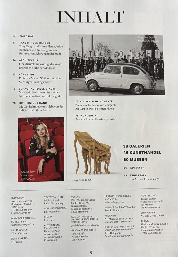 NewsArtikel in der „WELTKUNST“ Salzburg In dem Salzburg Special des Weltkunst-Magazins ist ein Artikel über meine Arbeit erschienen. Danke an Christa Sigg für den toll formulierten Text! Hier zu lesen mit Klick auf die Fotos: Inhaltsverzeichnis